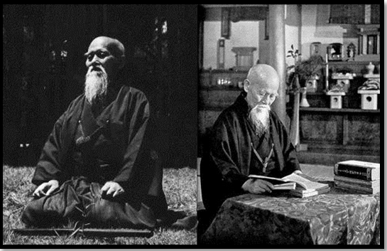 O´Sensei Morihei Ueshiba (fundador de Aikido) meditando (foto izquierda) y cultivando el espíritu (foto derecha)